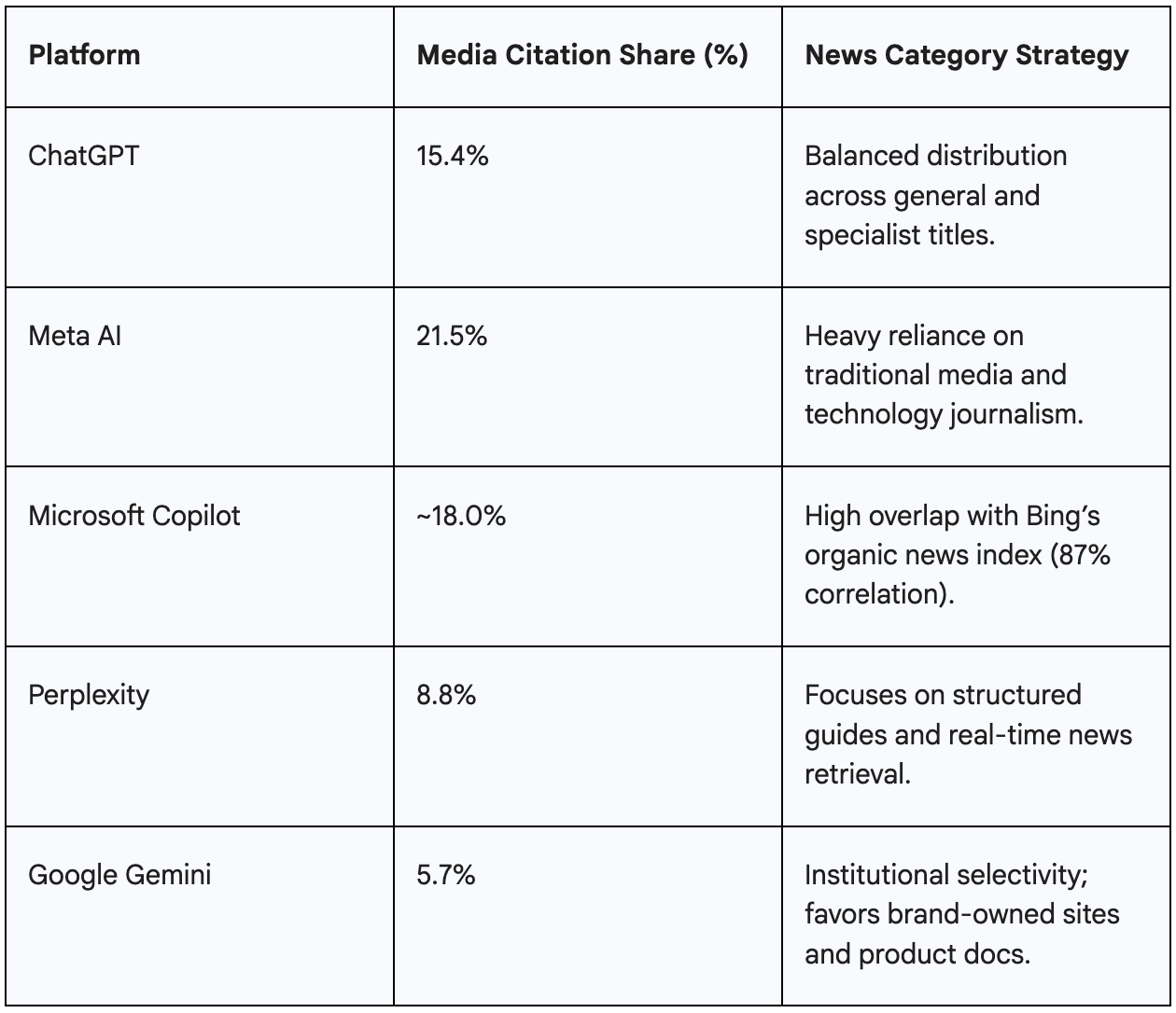 Now drill down further. Within AI answers, the competition for “top-tier” visibility is intense. Per a Gemini analysis drawing on disparate sources, AI platforms often concentrate 34% of their journalistic citations on just one or two dominant brands.