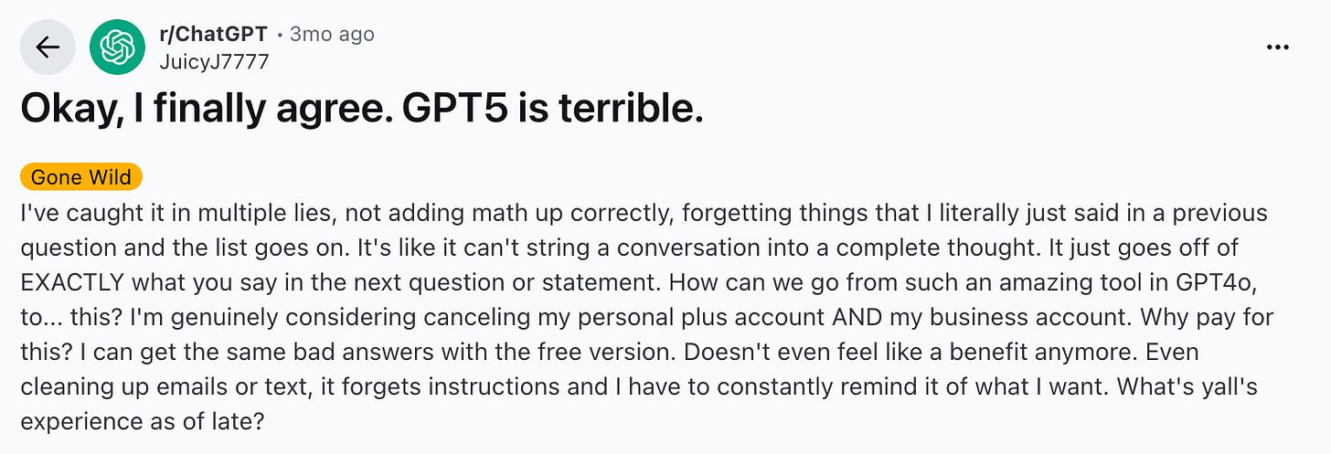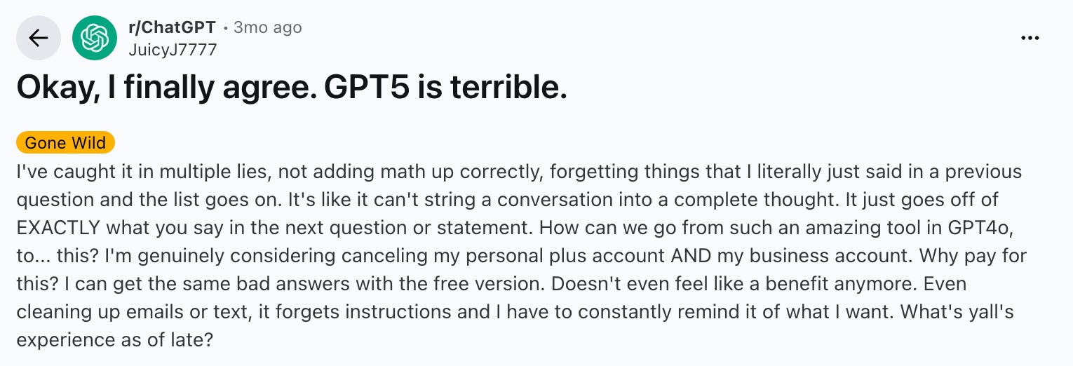 One user describes GPT “getting dumb” overnight. Another reports browser crashes and nonsensical repetition after months of reliable performance. Others describe GPT-5 as colder, less coherent, and oddly literal, unable to hold a conversational thread across turns. On the surface these read like isolated bug reports. But collective intuition indicates that something fundamental has changed.